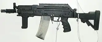 O Mini-Beryl com um trilho longo MIL-STD-1913, punho vertical e coronha telescópica. | |
