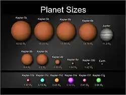 ![]() Representação artística de Kepler-11b e os outros cinco planetas do sistema planetário. | |