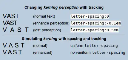 Por exemplo, em páginas com CSS1, um namoro padrão de volta a 1996, a propriedade letter-spacing (ilustrado) oferece algum controle para perdido ou reforçada "kerning percepção" — kerning podem ser simuladas com espaçamento não uniforme entre as letras. O CSS3 padrão (programado para 2014) inclui a propriedade kerning de fonte, que permite um controle completo do kerning.[19]