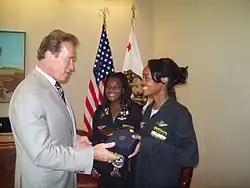 Anyadike (centro) e a irmã Kelly em encontro com o então governador da Califórnia, Arnold Schwarzenegger. | |