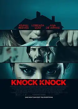 Lançado em 9 de outubro de 2015 pela Lionsgate Premiere, tem no elenco Keanu Reeves, Lorenza Izzo e Ana de Armas. É um tipo de reimaginação moderna do filme Death Game, de 1977, dirigido por Peter S. Traynor e estrelado por Sondra Locke e Colleen Camp. Todos os três indivíduos participaram da produção de Knock Knock, enquanto Camp também teve uma participação especial no filme mais recente.[9][10]