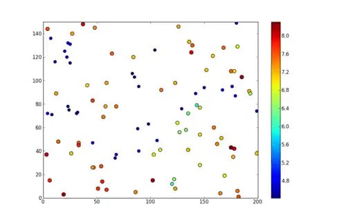 Na utilização da função o utilizador deverá introduzir como argumentos a matriz de dados (onde as colunas devem ser X, Y , valor, por esta ordem: 0,1,2), uma tupla com o número de blocos na dimensão X e Y, por exemplo: (150,200), e finalmente o valor da potência que se pretende utilizar (2 para o inverso do quadrado das distâncias). No exemplo seguinte a estimação vai ser feita numa matriz de 150 blocos na direção X e 200 blocos na direção Y com recurso à função transcrita acima e ao seguinte conjunto de dados: