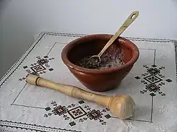 ![]() Kutia num prato fundo de cerâmica e um socador de madeira. | |