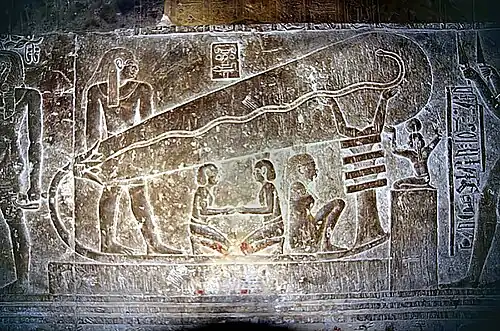 - ↑ Wolfgang Waitkus, Die Texte in den unteren Krypten des Hathortempels von Dendera: ihre Aussagen zur Funktion und Bedeutung dieser Räume, Mainz 1997 ISBN 3-8053-2322-0 (tr., The texts in the lower crypts of the Hathor temples of Dendera: their statements for the function and meaning of these areas)