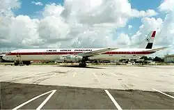 Em 1° de janeiro de 1985, um padrão técnico da FAA dos EUA entrou em vigor. Na prática, disse que o antigo Boeing 707 como da LAP seria tecnicamente proibido de voar para os EUA, a menos que esses aviões antigos fossem adaptados para ter silenciadores. O conselho da LAP foi forçado a optar por deixar essa rota para Miami (que representava 40% de sua receita) ou se adaptar com aeronaves mais silenciosas. Em meados de 1984, a empresa comprou um DC-8-63 com silenciadores (dispositivo instalado em aviões mais antigos para reduzir as emissões de ruído). A aeronave, registrada como ZP-CCH, configurada com 14 assentos na Primeira Classe e 195 na Classe Econômica, chegou a Assunção em 31 de dezembro de 1984 e entrou em operação regular para Miami em 1º de janeiro de 1985.