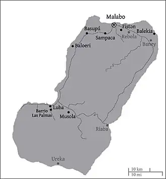 A língua crioula de Bioco é a mais falada na capital Malabo, superando até mesmo o espanhol e sendo a primeira língua da maioria dos habitantes. O pichi é a primeira língua também de cidades da costa da Ilha de Bioco, como Sampaca, Fiston, Basupú, Barrio las Palmas e Luba. O pichi é usado também como língua franca em toda a Ilha de Bioco.[2]