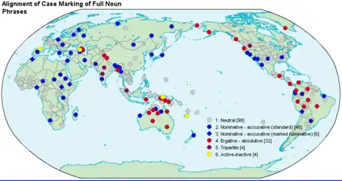 Todas as línguas europeias, menos o basco, são nominativo-acusativas. Este tipo de línguas contrastam com as de tipo ergativo-absolutivo. Na língua Dyirbal do norte da Austrália que é ergativa-absolutiva o S das frases intransitivas e o O das frases transitivas são tratados da mesma maneira,[1] usam o caso absolutivo para o S das frases intransitivas e o caso ergativo com o S das frases transitivas.[1] Daí que estas línguas sejam chamadas absolutivo-ergativas.