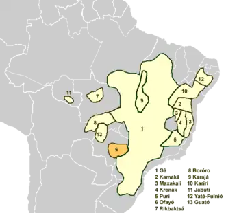 Rapidamente pode-se dizer que o tronco Macro-Jê em quase sua totalidade abrange um grande número de famílias, além da família Jê. Essa família, entretanto, é a mais numerosa e apresenta características comuns à língua falada por povos que habitam sobretudo, os campos e cerrados. Estende-se desde o sul do Maranhão e do Pará em direção ao sul, pelos estados de Goiás e Mato Grosso, até os campos meridionais dos estados de São Paulo, Paraná, Santa Catarina e Rio Grande do Sul. A família Jê contrasta com a família Tupi-guarani que compreende línguas faladas em áreas de florestas tropical e subtropical.[3]