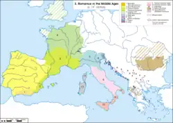 Após a descentralização do poder político na Antiguidade Tardia, o latim desenvolveu-se localmente nas províncias ocidentais em ramos que se tornaram as línguas românicas atuais, como por exemplo o português, castelhano, catalão, francês, italiano ou romeno, compondo a entidade linguística da România (Europa latina). Já as regiões pertencentes ao império onde as línguas neolatinas não desenvolveram-se ou desapareceram, foram denominadas como Romania submersa.[190][191][192]
