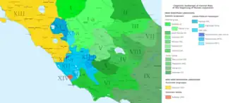 Mapa da distribuição aproximada das línguas faladas na Itália da Idade do Ferro durante o século VI a.C..