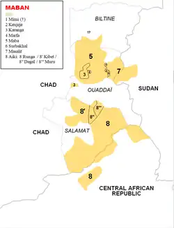 - Mabangue (quendeje, Maba (mabangue), marfa, massalate, massalite, surbacal, quibete, runga)