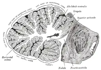 ![]() Seção sagital do cerebelo, próxima à junção do vermis com o hemisfério cerebelar. A língula está situada no canto superior direito.