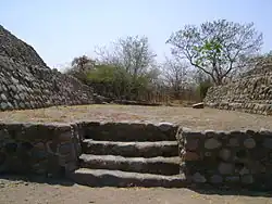 Este edifício caracteriza-se pelos seus enormes taludes e por corredores que definem diferentes corpos; a sua forma e orientação obedecem a conceitos geométricos e astronômico-religiosos mesoamericanos. Na sua parte alta existem praças, a seção inferior do templo tem acessos escalonados e é o lugar em onde os sacerdotes levavam a cabos os seus ritos mágicos. Sua orientação permitia observar sem obstáculos a saída e pôr-do-sol em datas importantes do seu calendário religioso. Foi utilizado e modificado também em alguns grupos pré-hispânicos tardios. Sua base mede 24 por 16 m.