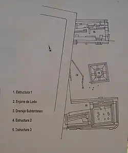 A um lado da Estrutura 2 do complexo arqueológico de La Campana encontram-se algumas pedras talhadas. Aqui também pode observar-se parte do sistema subterrâneo; realizado para coletar e evacuar a água das chuvas. Originalmente estava coberto com pedras. Seu traço segue o contorno dos edifícios.