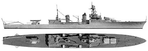 | Armamento | 9 canhões de 152 mm 8 canhões de 90 mm 8 metralhadoras de 13,2 mm 4 tubos de torpedo de 550 mm |