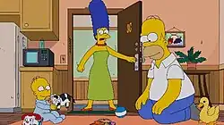 ![]() Marge (ao centro) se espanta com o afeto de Homer (à direita) a Homer Jr. (à esquerda). | |||||