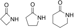 Uma lactama (o nome é um "portmanteau" das palavras lactona + amida) é uma amida cíclica. Prefixos indicam o tamanho do anel: β-lactama (4 átomos), γ-lactam (5 átomos), δ-lactama (anel de 6 átomos). Eta ordem na nomenclatura é porque beta β, gama γ e delta δ são a segunda, terceira e quarta letras em ordem alfabética do alfabeto grego, respectivamente.