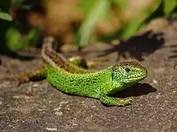 O Lagarto ágil (Lacerta agilis) é um réptil.[2] Habita a maioria da Europa (excepto a Península Ibérica, o oeste e sudoeste da França, a maioria da Bretanha e Itália, onde ele ocorre somente em colónias isoladas) e até a Mongólia. Tem o baixo-ventre claro e uma listra dorsal escura; durante a época de acasalamento, os machos assumem uma coloração verde-clara. O lagarto ágil chega a medir até 25cm de comprimento.