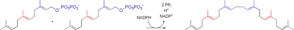 - Duas moléculas de farnesil pirofosfato condensam-se, com redução do NADPH, dando origem ao esqualeno - pela enzima esqualeno sintase;