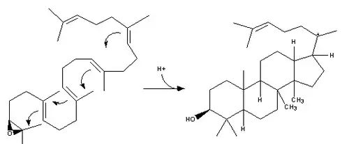 - O 2,3-oxidoesqualeno é convertido num anião proesterol e finalmente convertido em lanosterol, catalisado pela enzima lanosterol sintase: