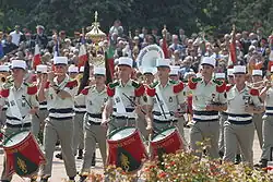 ![Um Caporal-Chef, com 3 divisas, durante o Desfile Militar do Dia da Bastilha.[73]](./_assets_/0c70a452f799bfe840676ee341124611/Foreign_Legion_bugler_Bastille_Day_2008.jpg)