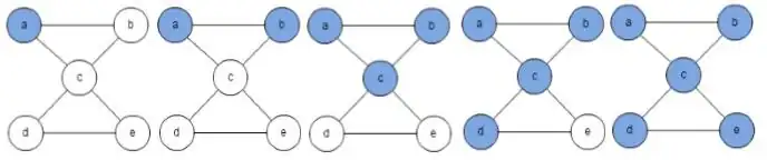 Sendo a e b os retornos da adoção de cada uma das opções, podemos então considerar que vale a pena adotar a nova tendência, caso q = b / (a+b) dos amigos adotem, designemos este valor por “valor de entrada”. [4] Para uma melhor compreensão, o caso da seguinte rede social composta por 2 cliques e 5 nós a,b,c,d,e sendo o nó a um early adopter de uma nova tecnologia, considerando como payoffs a=3 e b=2 e dando um valor de entrada q = 2/5, temos a seguinte dispersão: