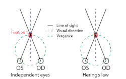 A lei de Hering da inervação igual é melhor compreendida com o estímulo de Johannes Peter Müller, onde um observador refoveia um ponto que se moveu em apenas um olho. A forma que exigiria menos esforço para refovear seria mover apenas o olho desalinhado. Em vez disso, a lei de Hering prevê que, como ambos os olhos devem se mover em quantidades iguais, uma combinação de movimentos oculares conjuntivos e disjuntivos é necessária para refovear o ponto alvo. Yarbus[5] mostrou experimentalmente que os movimentos oculares binoculares são de fato compostos principalmente por combinações de sacadas e vergência. No entanto, atualmente sabe-se que também ocorrem desvios claros da lei de Hering.[6][7][8]