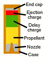 Estudos das reações de propelentes sólidos de base única e dupla sugerem a existência uma série de zonas ou fases conforme a reação prossegue da superfície para o sólido. A porção mais profunda do sólido que experimenta a transferência de calor derrete e começa a transição de fase de sólido para gás em uma "zona de espuma". O propelente gasoso se decompõe em moléculas mais simples em uma "zona de efervescência" circundante. A energia é então liberada na chamada "zona de chama externa luminosa", onde as moléculas de gás mais simples reagem para formar produtos de combustão convencionais, como vapor e monóxido de carbono. Os propelentes projetados para uma pressão mínima de transferência de calor podem falhar em sustentar a zona da chama em pressões mais baixas.[2]