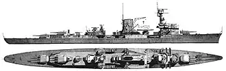 | Armamento | 9 canhões de 149 mm 2 canhões de 88 mm 12 tubos de torpedo de 500 mm |