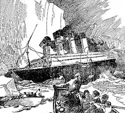 - ↑ Staff (16 de abril de 1912). «Titanic sinks four hours after hitting iceberg». The New York Times. pp. 1–2. Consultado em 19 de dezembro de 2008