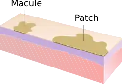 - Mancha: uma mancha é uma mácula igual ou maior que 5 mm de diâmetro, ou maior que 10mm (dependendo da definição de uma mácula). As manchas podem ter alguma alteração sutil da textura, áspera ou enrrugada, mas a própria lesão não é palpável. Pode ser causada pelo sol e por alterações hormonais.