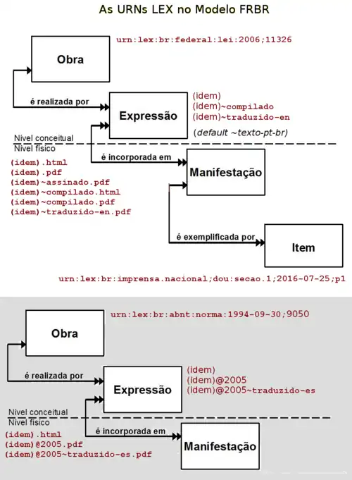 - urn:lex:abnt:norma:1994-09-30;9050@2015.pdf é uma URN LEX referenciando um arquivo formato PDF, portanto uma manifestação específica, e além disso a URN LEX está designando também uma versão específica da obra.