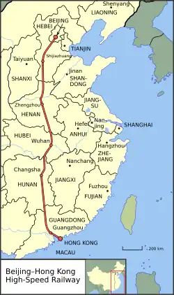 O trecho da linha entre Pequim e Cantão é a maior linha de alta velocidade ferroviária do mundo, com uma extensão de 2298 km. Presentemente a linha conecta Pequim e Cantão, polo industrial no sul do país, com paragens intermédias em 35 cidades importantes no interior chinês: além das cidades terminais param nas principais cidades do interior da China, como Shijiazhuang, Zhengzhou, Wuhan e Changsha, passando por seis províncias onde vivem cerca de 600 milhões de pessoas, quase metade da população da República Popular da China.[1]