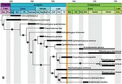 - ↑ Sidor, Christian A.; Hopson, James A. (20 de maio de 2016). «Ghost lineages and "mammalness": assessing the temporal pattern of character acquisition in the Synapsida» [Linhagens fantasmas e “mamíferos”: avaliando o padrão temporal de aquisição de caracteres nos Synapsida]. Cambridge University Press. Paleobiology. 24 (2): 254-273. doi:10.1666/0094-8373(1998)024[0254:GLAATT]2.3.CO;2. Consultado em 11 de fevereiro de 2025