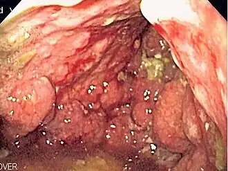 | Imagem endoscópica de uma linites plástica, onde todo o estômago está invadido pelo câncer gástrico, mostrando um aspecto de "garrafa de couro". | |