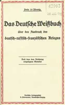 O Livro Branco Alemão (em alemão: Das Deutsche Weißbuch) foi uma publicação do governo alemão de 1914 documentando suas alegações sobre as causas da Primeira Guerra Mundial [25] [44] A instituição britânica dos livros azuis políticos, com publicações oficiais de documentos diplomáticos, chegou à Alemanha relativamente tarde. Houve um debate acirrado sobre a sua adequação e necessidade muito antes do surgimento do primeiro livro azul alemão, e também posteriormente entre o público alemão, especialmente nos parlamentos estaduais (Landtag). [45]