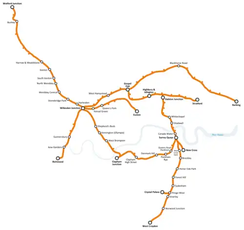| Operadora(s) | London Overground Rail Operations Ltd (LOROL) (contrato/franquia com a TfL 2007–2016) | ||