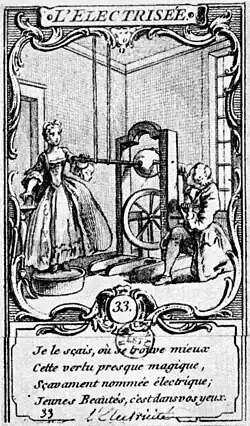Os primeiros geradores eletrostáticos são chamados de máquinas de fricção devido ao atrito no processo de geração. Uma forma primitiva de máquina de fricção foi inventada por volta de 1663 por Otto von Guericke, era constituída por uma esfera de enxofre que girava constantemente em terra seca, o que gerava um atrito e consequentemente eletricidade.[1] Por volta de 1706, Francis Hauksbee melhorou o design básico, com sua máquina elétrica de fricção que permitia que uma esfera de vidro girasse rapidamente contra um tecido de .[2]