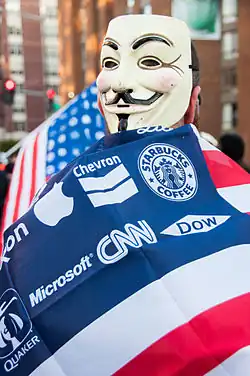 À medida que os protestos continuavam, mais manifestantes começaram a usar a máscara de Guy Fawkes, que acabou assumindo um status simbólico dentro do grupo.[21][22] Scott Stewart do The Gateway, da Universidade de Nebraska, escreveu: "Muitos participantes usavam máscaras de Guy Fawkes para chamar a atenção tanto para sua identidade como Anonymous quanto para o abuso de litígio e coerção da Igreja da Cientologia para suprimir pontos de vista anticientíficos."[20] Internet-adotou o personagem para seus protestos mais amplos contra a autoridade.[21][22][23][24] Uma versão da máscara foi usada posteriormente na série de televisão de 2015 Mr. Robot para representar o grupo hacktivista F-Society, em referência ao Anonymous. Uso mais amplo em protestos populares. Em 23 de maio de 2009, manifestantes usando a máscara detonaram um barril de pólvora falso do lado de fora do Parlamento enquanto protestavam contra a questão das despesas dos parlamentares britânicos.[25] Durante os protestos de protestos de 2011 em Wisconsin e, posteriormente, durante o Occupy Wall Street e o contínuo movimento Occupy a máscara apareceu internacionalmente[22] como um símbolo de rebelião popular. Em outubro de 2011, o ativista Julian Assange participou do evento Occupy London na Bolsa de Valores de Londres usando uma máscara desse tipo, que ele retirou após um pedido da polícia.[13]