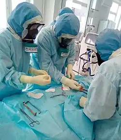 Uma máscara cirúrgica é uma máscara descartável de ajuste solto que cria uma barreira física separando a boca e o nariz do usuário de possíveis contaminantes no ambiente imediato. Se usada corretamente, destina-se a ajudar a bloquear gotículas de partículas grandes, respingos, sprays ou borrifos que podem conter vírus e bactérias, impedindo que cheguem à boca e ao nariz do usuário. As máscaras cirúrgicas também podem ajudar a reduzir a exposição de outras pessoas à saliva e às secreções respiratórias do usuário.[31][32]