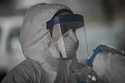 O CDC afirmou que o pessoal de saúde deve usar um respirador aprovado pelo NIOSH N95 (ou equivalente ou de nível superior) ou uma máscara facial (se um respirador não estiver disponível) com um protetor facial ou óculos como parte de seu equipamento de proteção individual, enquanto pacientes com suspeita ou confirmação de infecção por SARS-CoV-2 devem usar uma máscara facial ou cobertura facial de pano durante o transporte.[96] Como estratégia de crise para escassez conhecida de respiradores N95 em ambientes de saúde, entre outras medidas sequenciais, o CDC sugere o uso de respiradores além da vida útil designada pelo fabricante, uso de respiradores aprovados sob padrões usados em outros países que sejam semelhantes aos respiradores aprovados pelo NIOSH, reutilização limitada de respiradores, uso de respiradores adicionais além da vida útil designada pelo fabricante que não foram avaliados pelo NIOSH e priorização do uso de respiradores e máscaras faciais por tipo de atividade.[97]