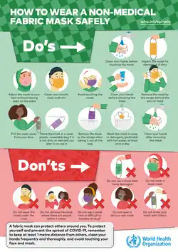 Em relação ao uso de máscaras de tecido não médicas na população em geral, a OMS afirmou que evidências de alta qualidade para seu uso generalizado são limitadas, mas aconselha os governos a incentivar seu uso, pois o distanciamento físico pode não ser possível em alguns ambientes, há alguma evidência de transmissão assintomática, e as máscaras podem ser úteis para fornecer uma barreira para limitar a disseminação de gotículas potencialmente infecciosas.[81]
