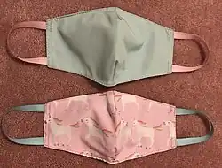 Uma máscara de tecido é usada sobre a boca e o nariz e feita de tecidos comuns, como algodão. As máscaras variam amplamente em eficácia, dependendo de fatores como material, ajuste e vedação, e número de camadas. Geralmente são menos eficazes na filtragem do que máscaras cirúrgicas e oferecem muito menos proteção.[17][18] Ao contrário das máscaras descartáveis, não há padrões obrigatórios para máscaras de tecido.[19]