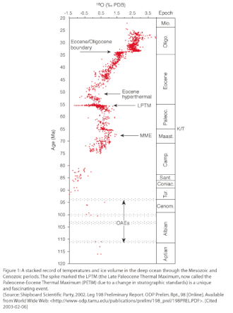 |nome1=sem|sobrenome1=em Authors list (ajuda) - ↑ Zachos, J.C.; Lohmann, K.C; Walker, J.C.G.; Wise, S.W.. "Abrupt climate change and transient climates during the Palaeogene: A marine perspective" .
