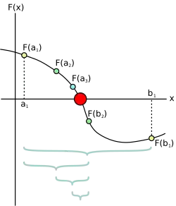 Como a função é contínua, sabemos que existe uma raiz no intervalo . A primeira iteração gera , e . Como é negativa, se tornará nosso novo para que continuemos tendo e com sinais opostos, e com isso saber que a raiz se encontra em . Repetindo esses passos, teremos intervalos cada vez menores até que o valor de convirja para o zero de nossa equação. Veja os valores plotados na tabela abaixo: