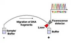 Depois que a reação é executada, os fragmentos são levados através de um longo e fino tubo sob uma matriz de gel em um processo chamado de eletroforese capilar em gel, onde pequenos fragmentos movem-se rapidamente através dos poros de gel, enquanto longos fragmentos movem-se mais devagar. Assim que cada fragmento cruza a ‘‘linha de chegada’’ no final tubo, ele é iluminado por um laser, permitindo que o corante anexado seja detectado.