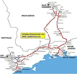 A malha ferroviária da MRS Logística conta com 1.643 km e fica localizada em 3 estados: Minas Gerais, Rio de Janeiro e São Paulo.[10]