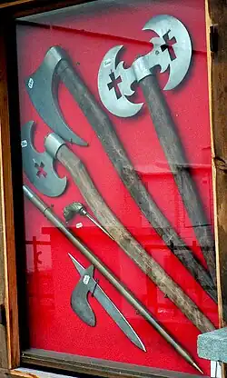 Com o tempo, o machado foi substituído por armas de haste como as alabardas que não só tinham a parte cortante como o machado, como também ponta de lança, martelos, espigões e ganchos.
