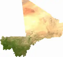 O Mali[7] ou Máli,[8][9] oficialmente República do Mali, (em bambara, Mali ka Fasojamana)[10] é um país africano sem saída para o mar na África Ocidental. O Mali é o sétimo maior país da África. Limita-se com sete países, a norte pela Argélia, a leste pelo Níger, a oeste pela Mauritânia e Senegal e ao sul pela Costa do Marfim, Guiné e Burquina Fasso. O Mali tem uma área de 1 240 000 km² e a sua população é estimada em cerca de 24,5 milhões de habitantes.[11] A capital do país é Bamaco.
