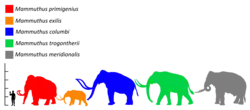 Os primeiros membros conhecidos do gênero mammuthus são as espécies africanas M. subplanifrons do plioceno e o M. africanavus do pleistoceno. O primeiro é pensado para ser o antepassado das espécies posteriores. O mamute entrou na Europa há cerca de 3 milhões de anos. O primeiro mamute europeu foi chamado de M. rumanus, que se espalhou por toda a Europa e China.[1]